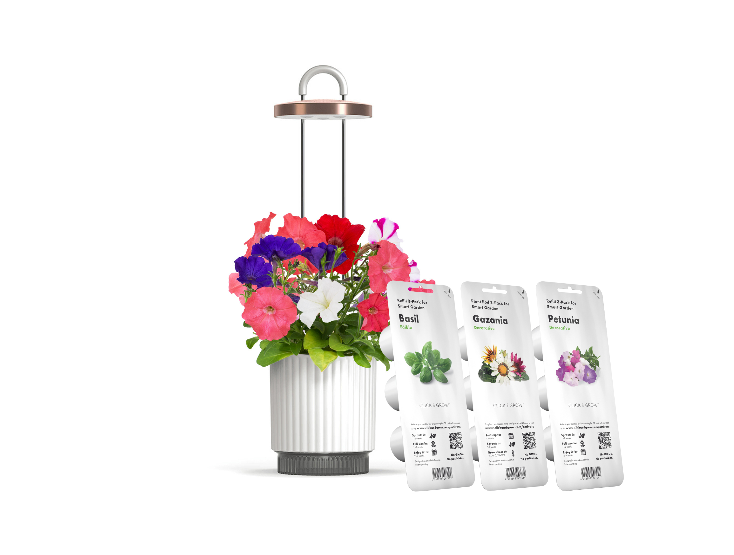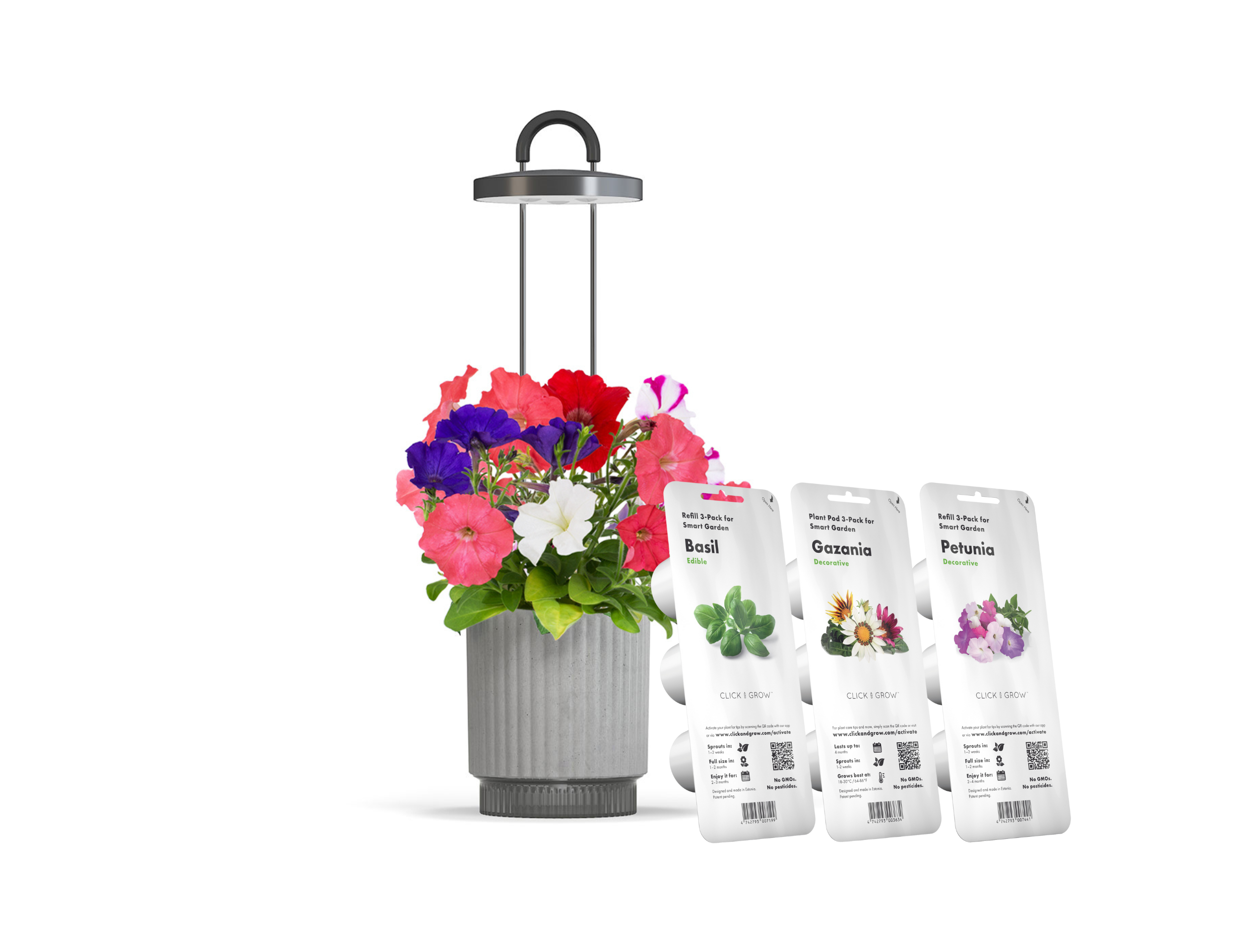 1x Click & Grow Gazania 1x Petunia, and 1x Basil Plant Pod 3-packs.